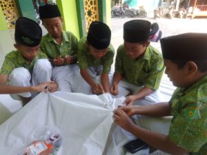 Tepat pada tanggal 27 Mei sampai 04 Juni 2023 dengan semangat dan antusiasme, para siswa siswi kelas akhir MI Maslakul Huda menyiapkan alat dan bahan yang mereka butuhkan untuk kegiatan praktik membuat taplak meja dengan teknik batik jumputan. Benang-benang berwarna yang cerah tersusun rapi di atas meja kayu, dan jarum-jarum tumpul siap digunakan. Mereka mengambil tempat di sekitar meja dan menyiapkan kain putih yang akan dijadikan taplak meja.
